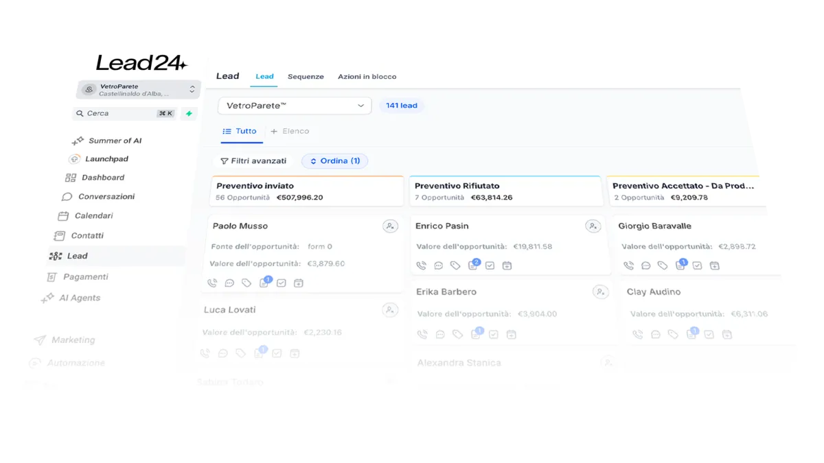 Formiamo te e il tuo team commerciale a usare Lead24 per gestire al meglio le richieste in arrivo fornendoti il nostro metodo. Ti spiegheremo la dashboard, la pipeline di vendita, come gestire i contatti e tutti gli strumenti che ti aiuteranno a vendere di più.